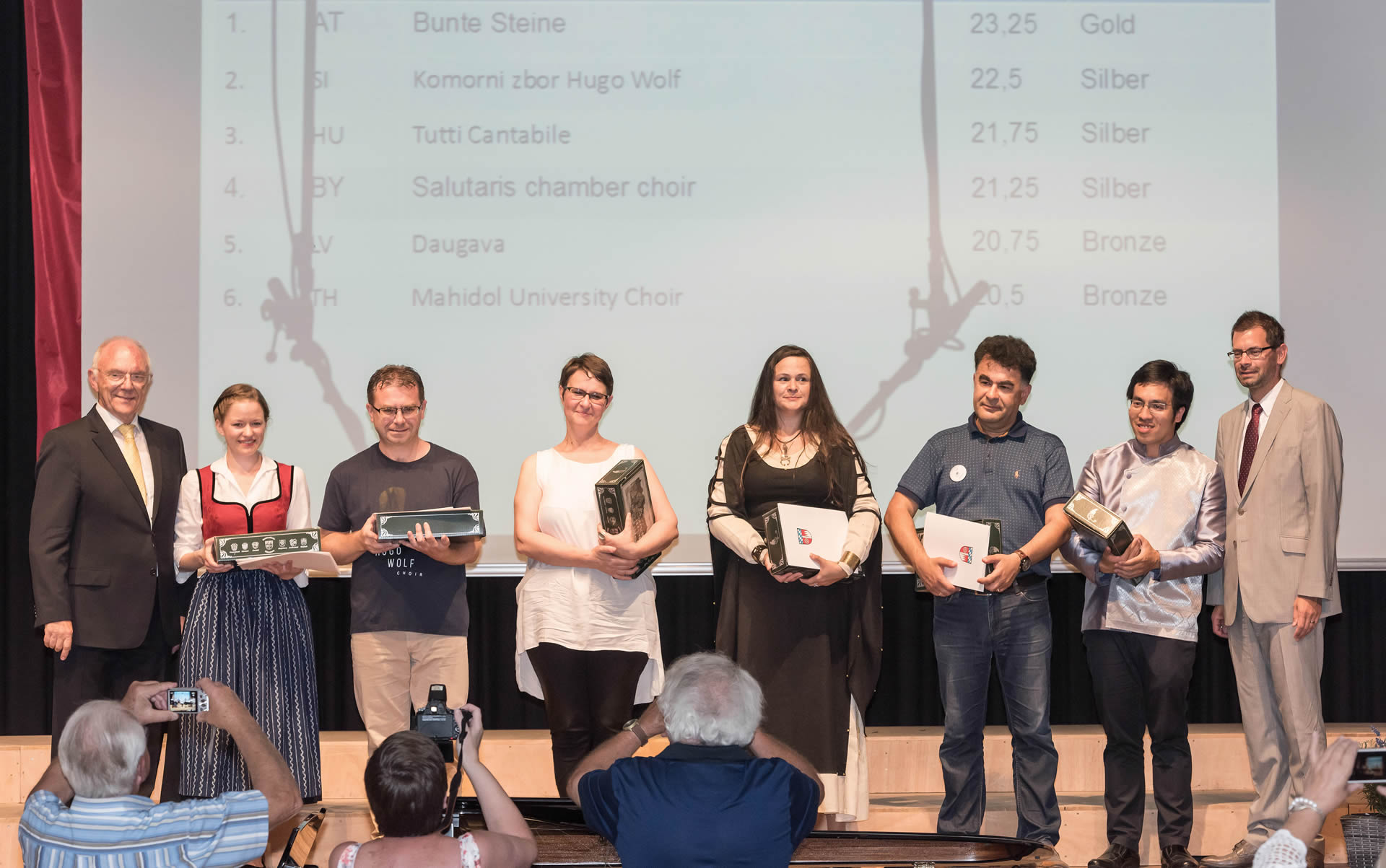Am Ende holte sich der Kammerchor „Bunte Steine“ aus Österreich den Sieg in der Kategorie A, gefolgt vom slowenischen Kammerchor Hugo Wolf, dem Tutti Cantabile Vocal Ensemble aus Ungarn, dem weißrussischen Chor Salutaris, dem gemischten Chor Daugava aus Lettland und dem Mahidol University Choir aus Thailand.