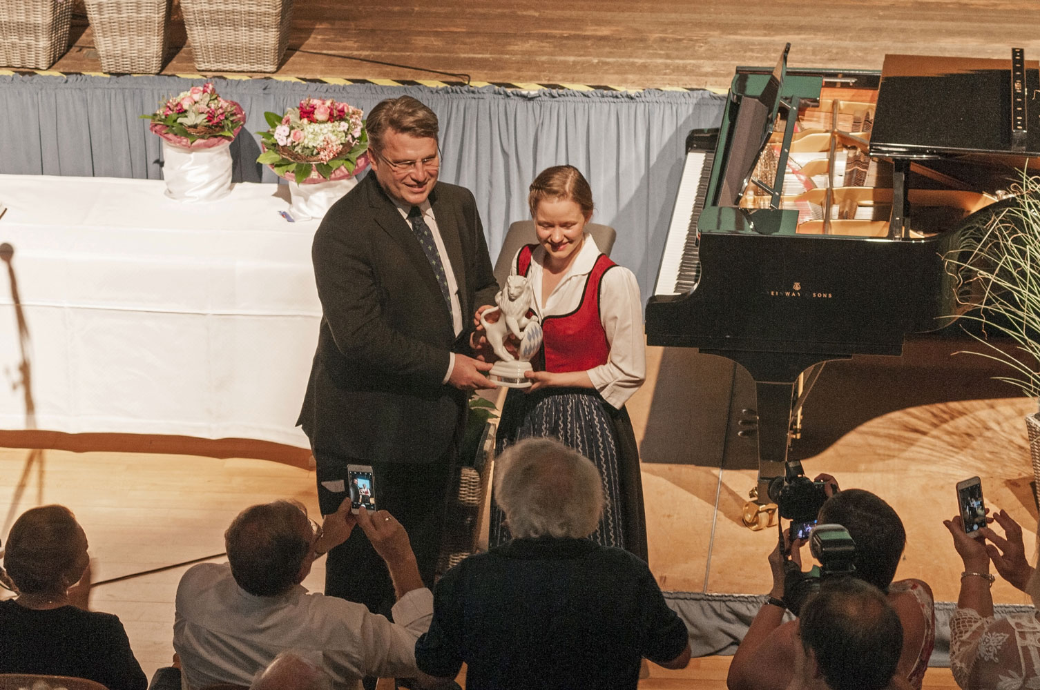 Der Ehrenpreis – der Bayerische Löwe – des Bayerischen Ministerpräsidenten Dr. Markus Söder für die beste Interpretation des Pflichtstückes „Adios Nonino“ wurde von Staatsminister Prof. Dr. Winfried Bausback an „Bunte Steine“ aus Österreich überreicht.